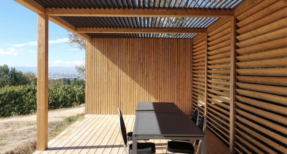 Die bioklimatische Pergola reguliert die Temperatur durch Schatten und Belüftung.